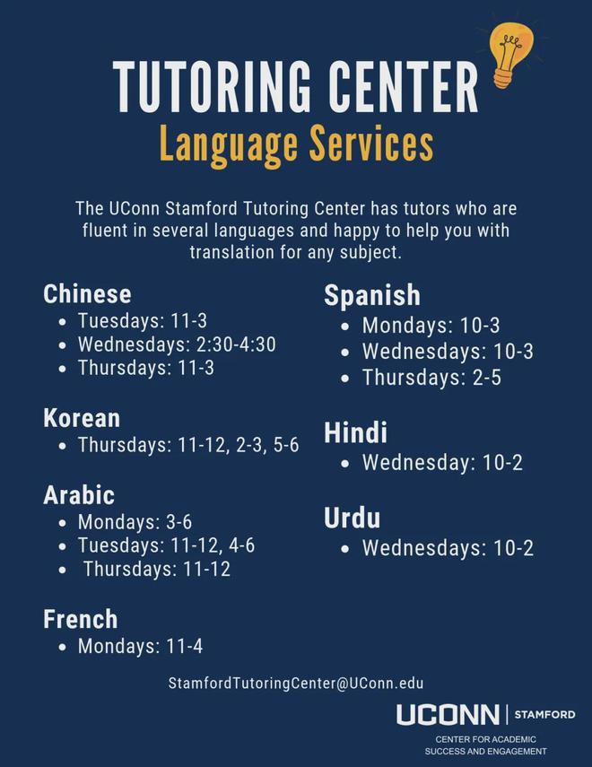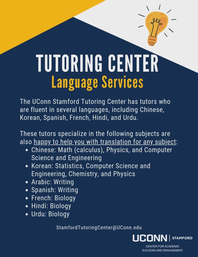 辅导中心的导师们精通多种语言,包括中文、韩语、西班牙语、法语、印地语和乌尔都语等。这些导师专注于许多科目,也很乐意帮助学生翻译任何科目。